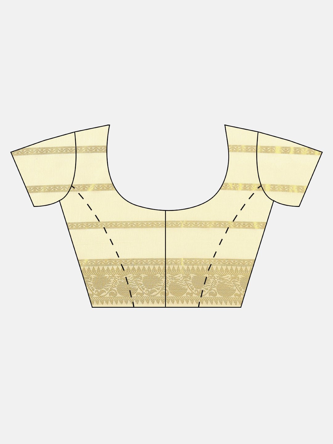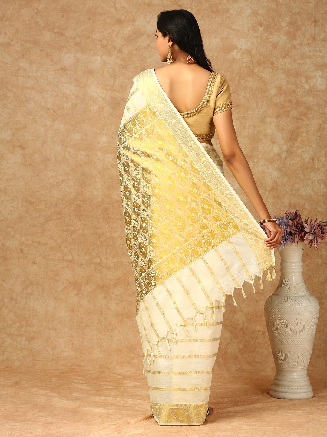 - Design: The hallmark of a Kasavu saree is its minimalistic design with a distinctive gold or silver border. The border, known as the “Kasavu” in Malayalam, is usually made of metallic thread and adds a touch of sophistication to the saree.