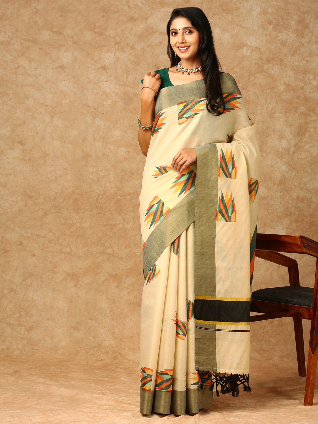 Women Kerala Cream Printed Saree KS145