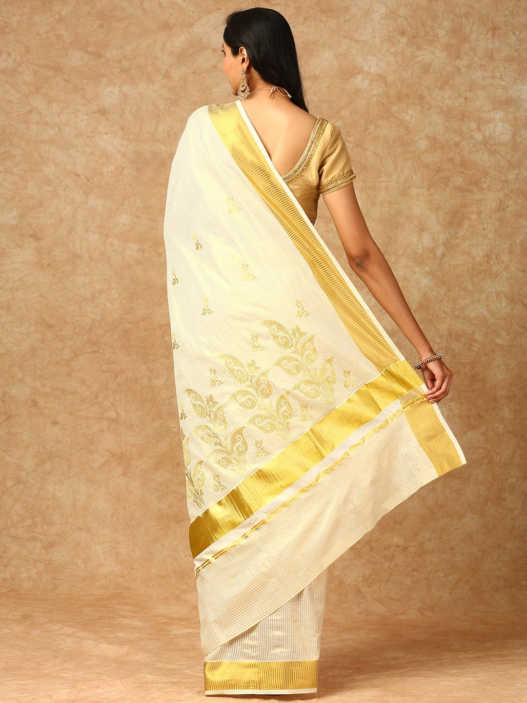 - Fabric: Traditionally, Kasavu sarees are made of cotton, which is ideal for Kerala’s tropical climate. They are light and breathable, offering comfort while maintaining elegance.