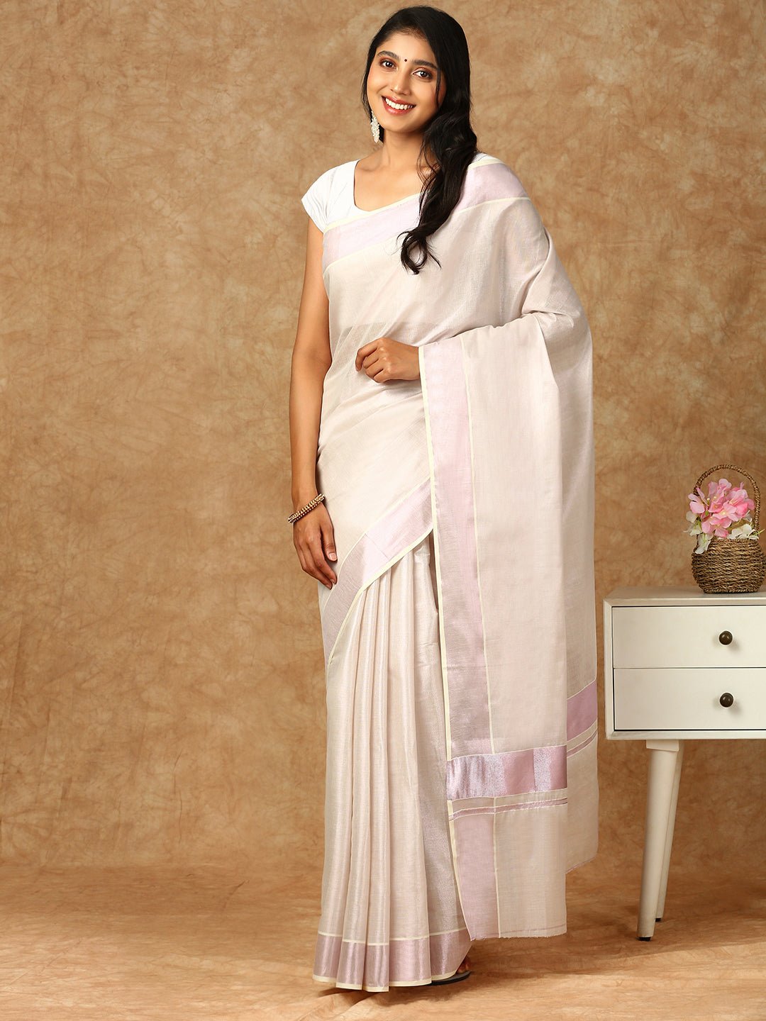 The saree is typically enhanced with a rich zari border, which can be intricately woven in border or even contrasting colors, giving the saree a regal touch. The zari motifs along the pallu often feature traditional designs like paisleys, peacocks, and floral patterns, meticulously crafted to add depth and texture to the fabric. These embellishments are a testament to the rich textile heritage of Kerala, making the saree an elegant representation of the region’s artistry.