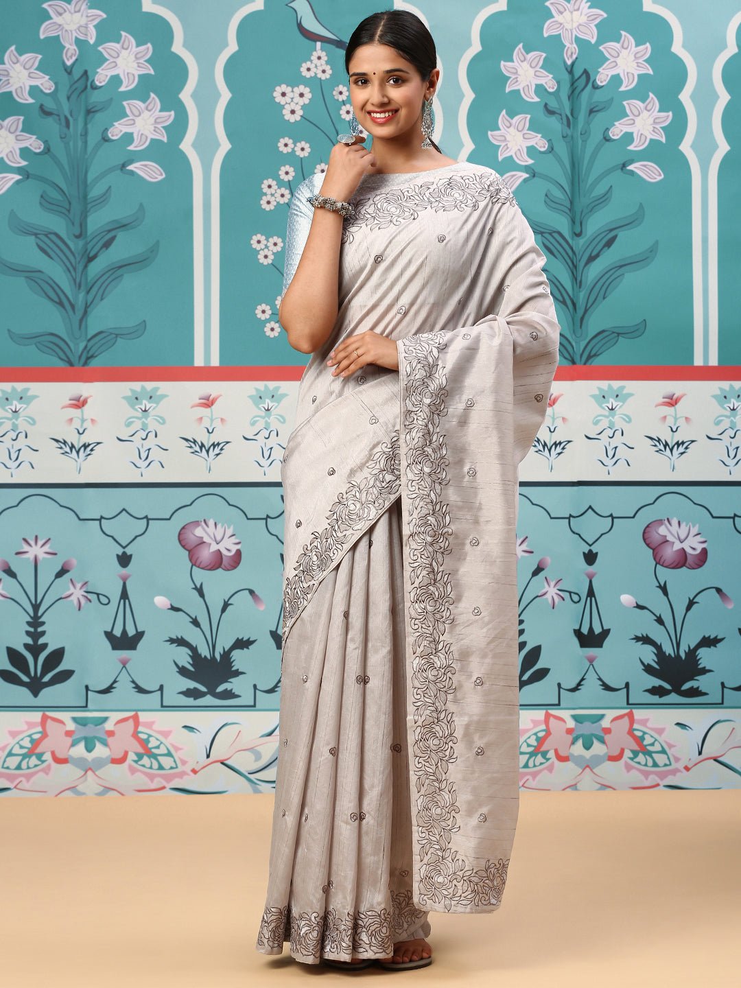 Women Semi Tussar Embroidery Saree Grey