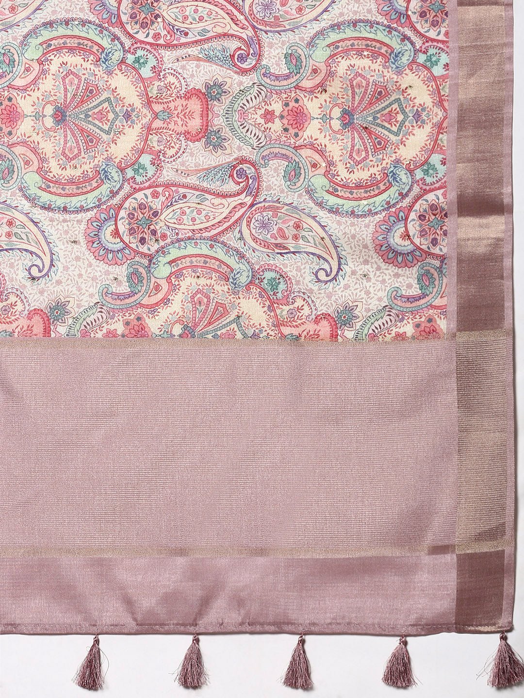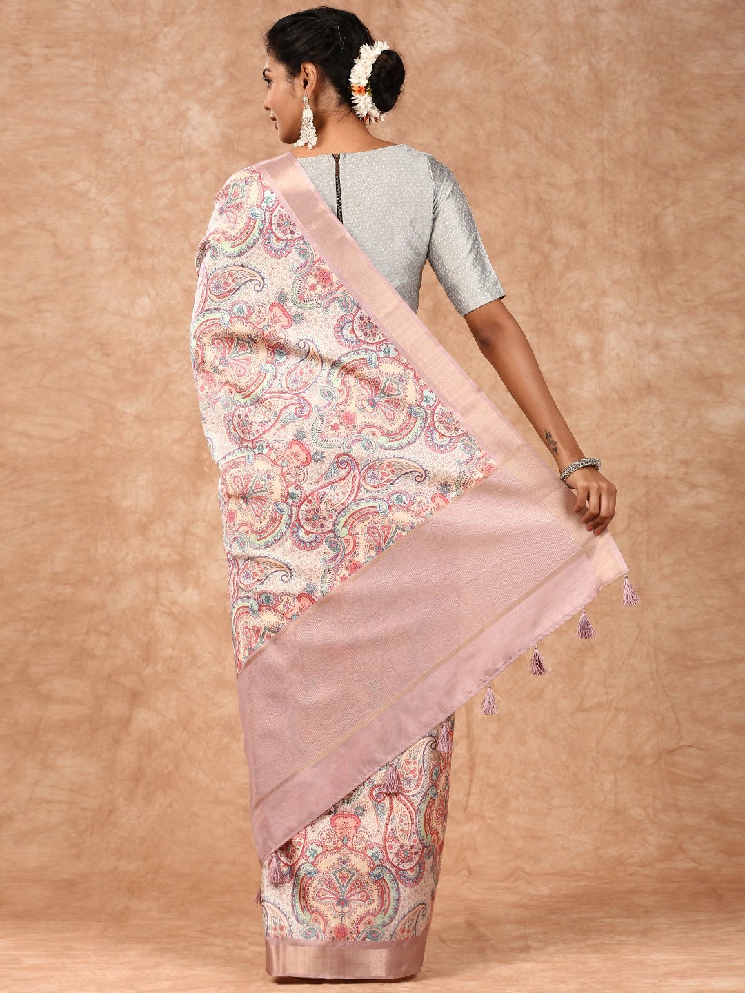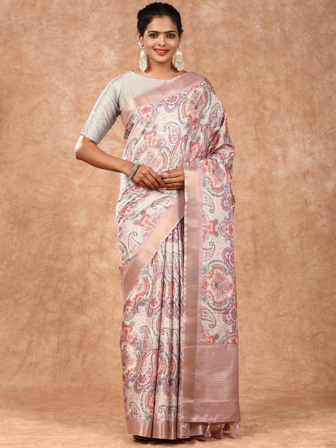 A Semi Tussar Printed saree is a type of Indian traditional garment made from a semi-tussar fabric that has been printed with a design. Semi Tussar Printed saree are lightweight, breathable, and easy to drape, making them ideal for all-day wear. They can be styled in a variety of ways, depending on the occasion and personal preference. They can be paired with a simple blouse for a casual look or with a heavily embellished blouse for a more formal event. Overall, a Semi Tussar Printed saree is a versatile and elegant garment that can add a touch of traditional charm to any wardrobe.